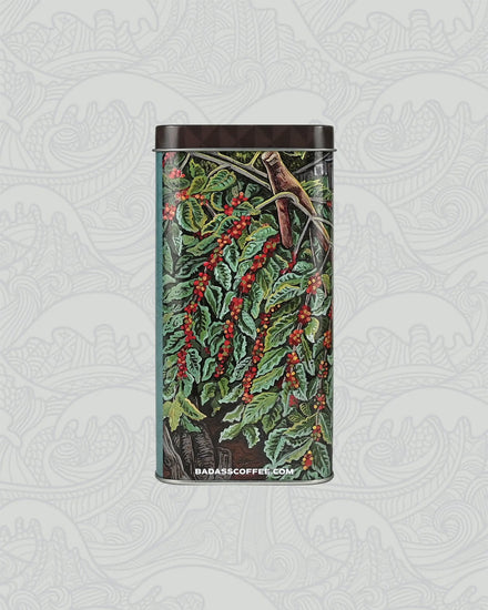 Tin measures 7-in tall x 6-in wide x 3.5-in deep. Fits one of our new 12oz bags of coffee.