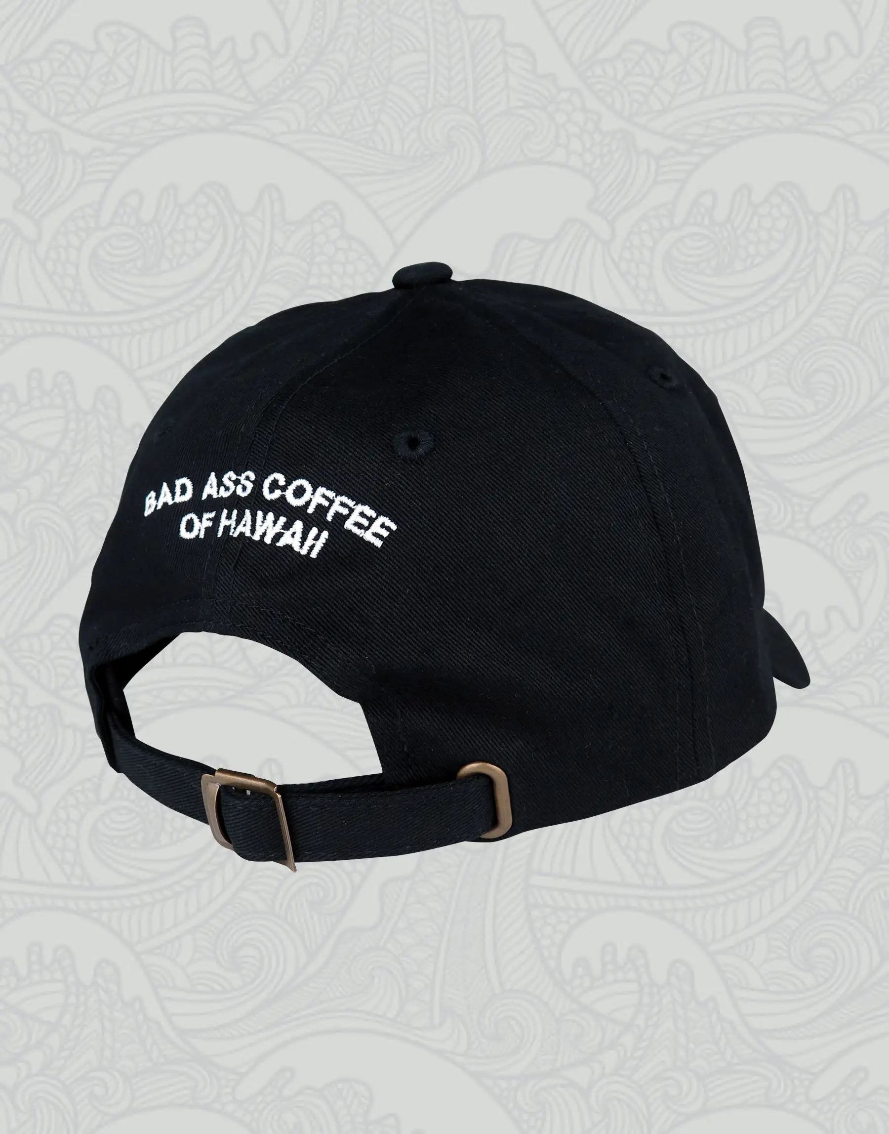 This classic black hat is ready to make a statement. Our iconic Jack logo on the front, with Bad Ass Coffee of Hawaii on the back, both embroidered in white. Features an adjustable strap with antique bronze detailing ready to fit any badass out there.