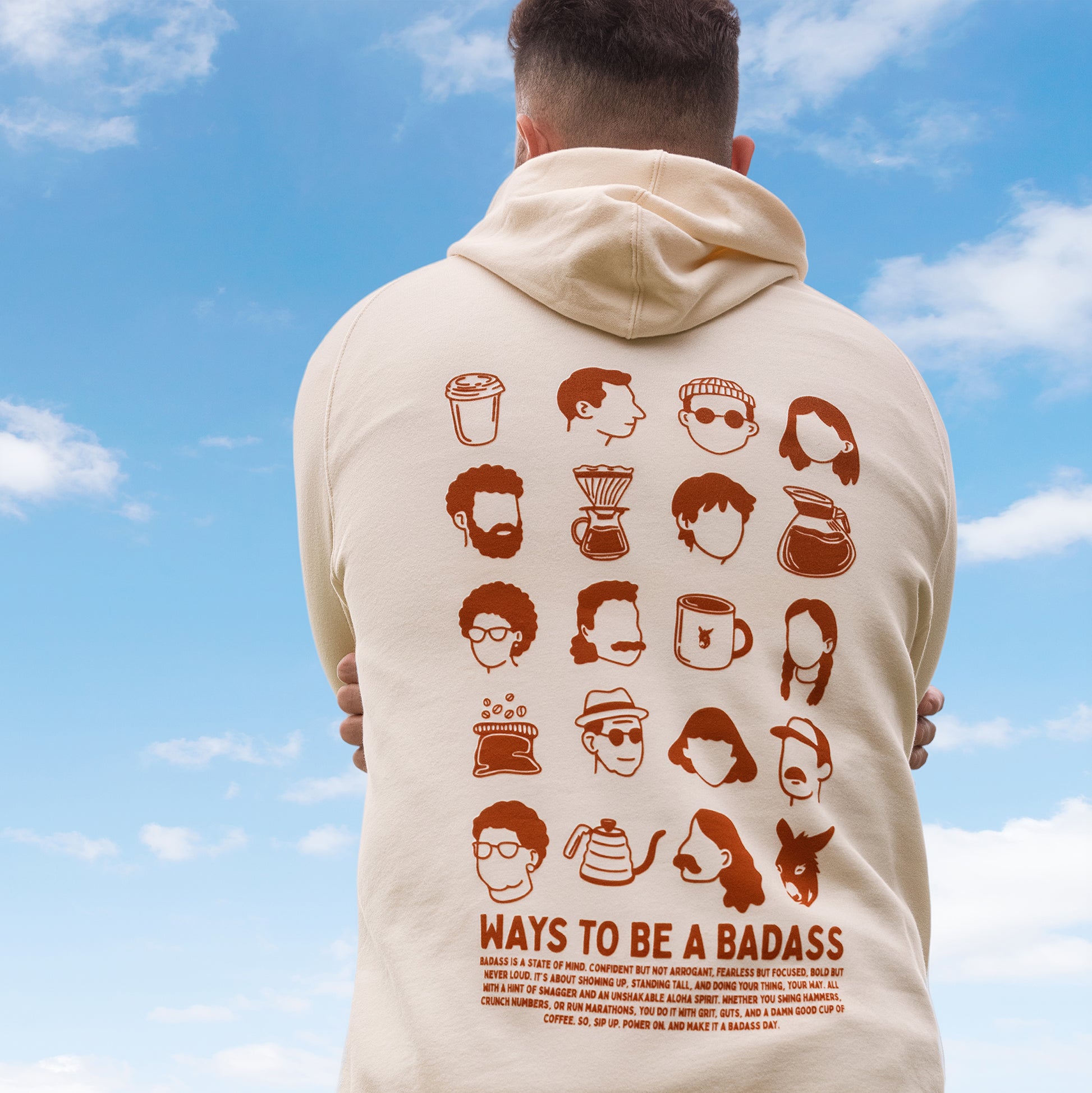 The Ways To Be A Badass Hoodie blends everyday comfort with the bold spirit of our brand. This soft ecru hoodie features our logo on the front and our full “Ways To Be A Badass” manifesto on the back, a reminder to live confident, fearless, and fueled by coffee. Cozy enough for downtime, powerful enough to make a statement.
